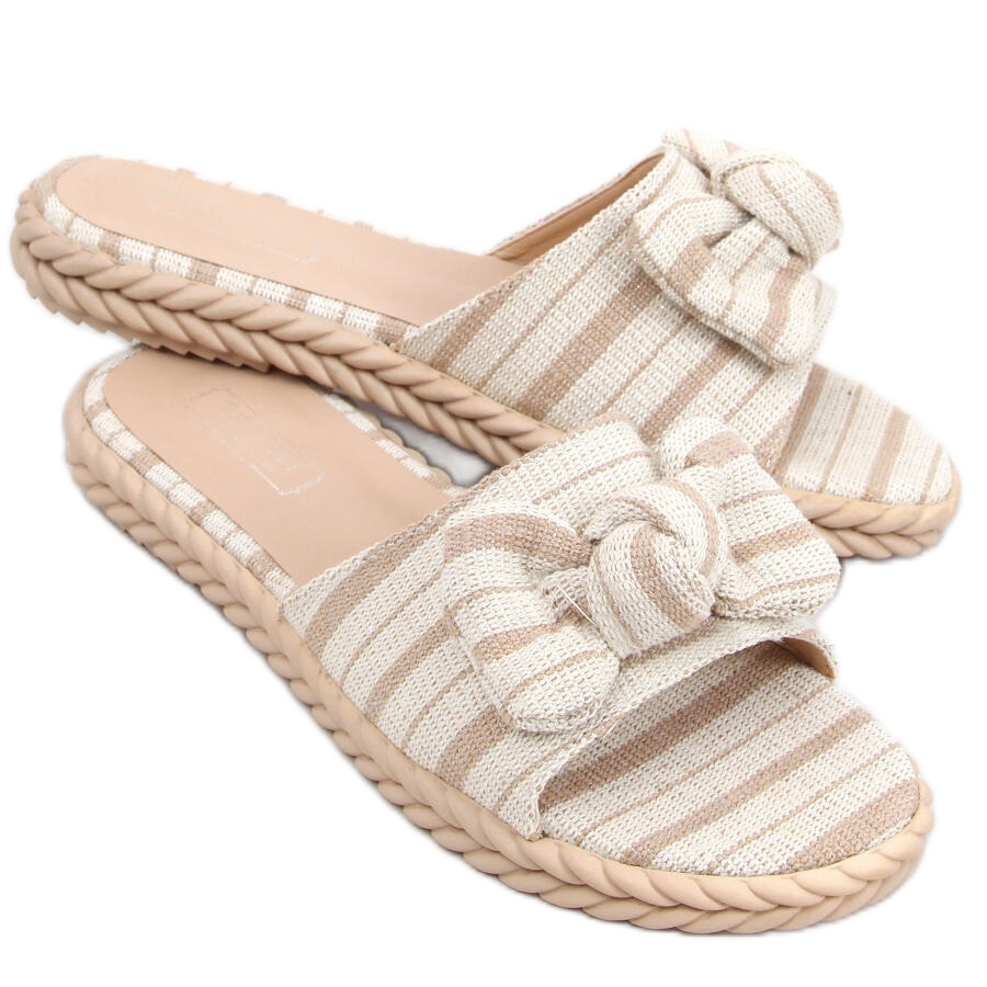 Adana Apricot women's flip-flops in beige are the perfect choice for summer days! These stylish flip-flops on a flat sole combine functionality with a fashionable design. Thanks to a beautiful bow at the front and an original striped pattern, they will be a perfect complement to any summer styling, adding lightness and romanticism.
