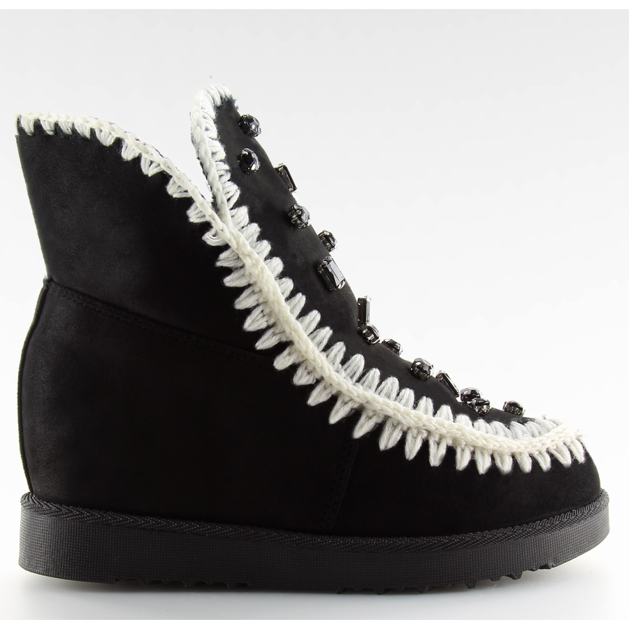 Stunning black women's ankle boots with a 5.5 cm high wedge that combine a fashionable look with everyday comfort. The front is decorated with elegant rhinestones, and the decorative wool stitch adds character and a unique finish. The high sole insulates against the cold, and the fur-lined interior guarantees pleasant warmth on colder days.