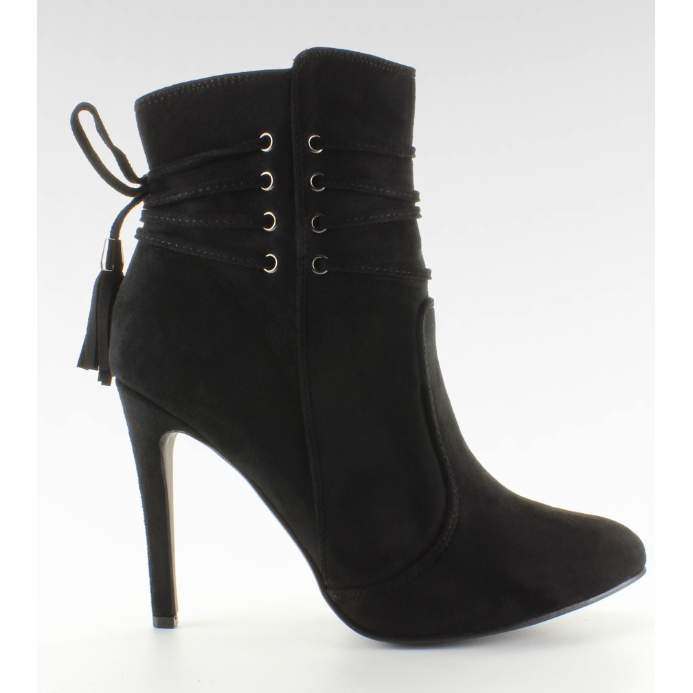 High heel ankle boots 4074 Black - sensual, elegant and practical. Classic black boots made of ecological suede, with insulation made of delicate fur, perfect for colder days. A 10 cm high stiletto slims the figure, and subtle strings with fringes around the ankle add a stylish accent. There is a zipper on the inside that makes it easy to put on quickly.