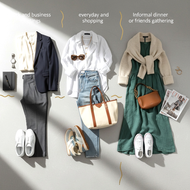 For work and business meetings: White slim-line sneakers go perfectly with fitted trousers in shades of gray or navy blue. For the top, choose a silky blouse or a minimalist jacket. This style is both professional and fresh-looking - perfect for a casual Friday at the office or a meeting with a client in a creative industry.