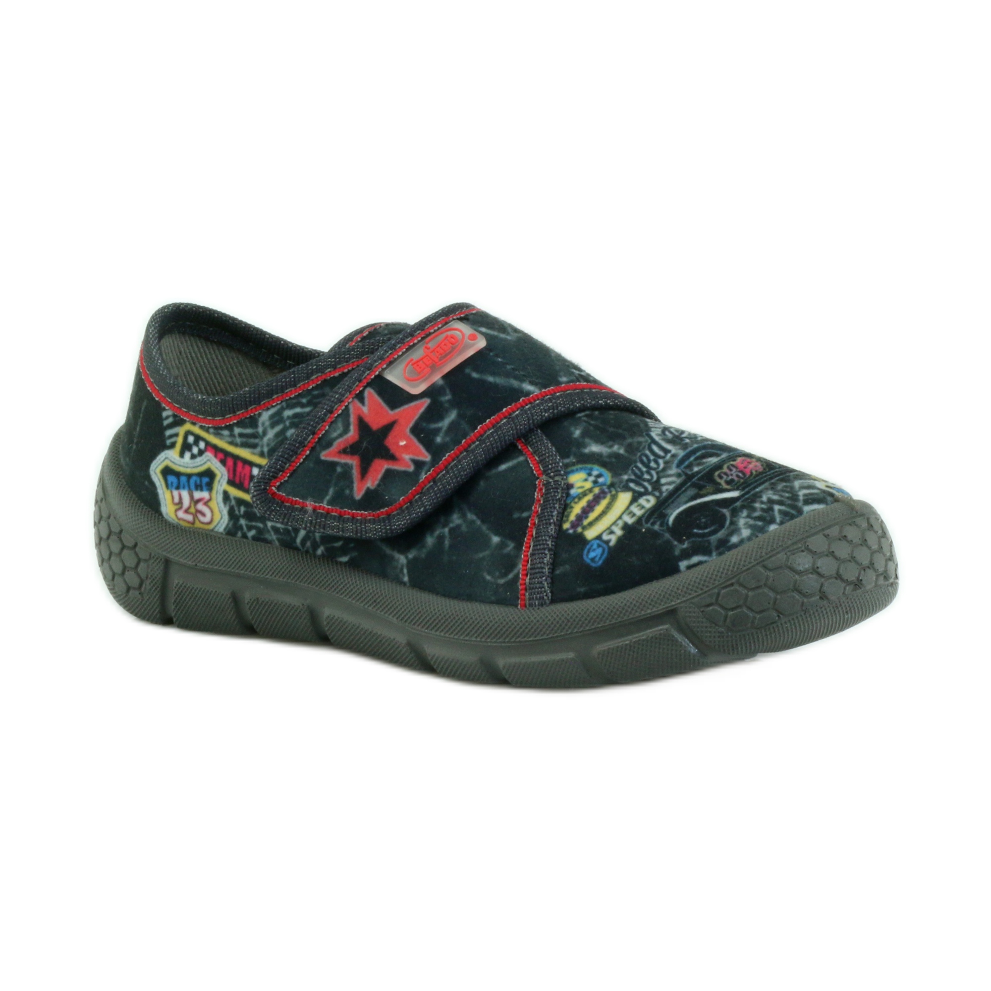Uppers made of breathable cotton fabrics guarantee proper hygiene and comfort of wearing all day long. Additionally, a specific rigid heel counter stabilizes the heel, which is crucial in the developing skeletal system of children. Velcro fastening is another advantage, which allows for quick and easy putting on and taking off of the shoes.