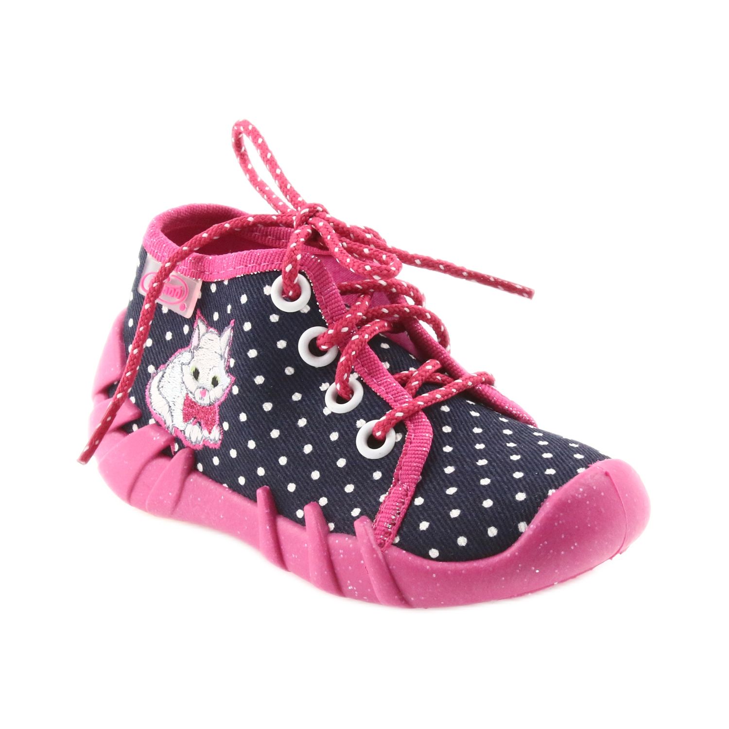 These adorable white, pink and navy blue shoes, decorated with funny dots and a cat motif, combine modern design with functionality. Made of high-quality cotton fabric, they provide adequate ventilation, which is crucial for the health of a child's feet. Thanks to the use of breathable material in the sole, the slippers maintain hygiene and comfort when worn, even for a longer period of time.