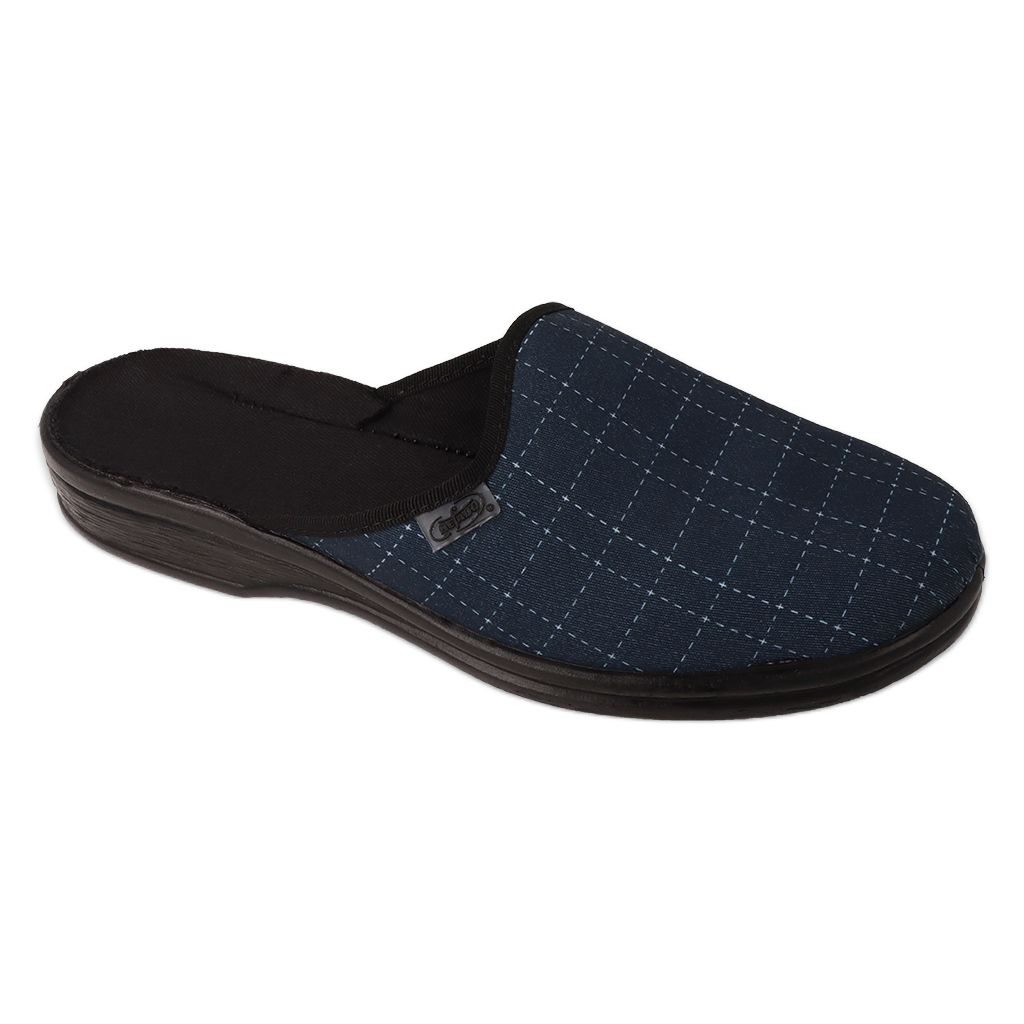 We present Befado men's slippers in an elegant grille pattern (model 089m423) in shades of navy blue and blue, which will be an ideal companion after a long day of work. Designed for comfort, these slippers are made of high quality, soft and natural fabrics that provide excellent ventilation, allowing your feet to remain fresh throughout the wearing.