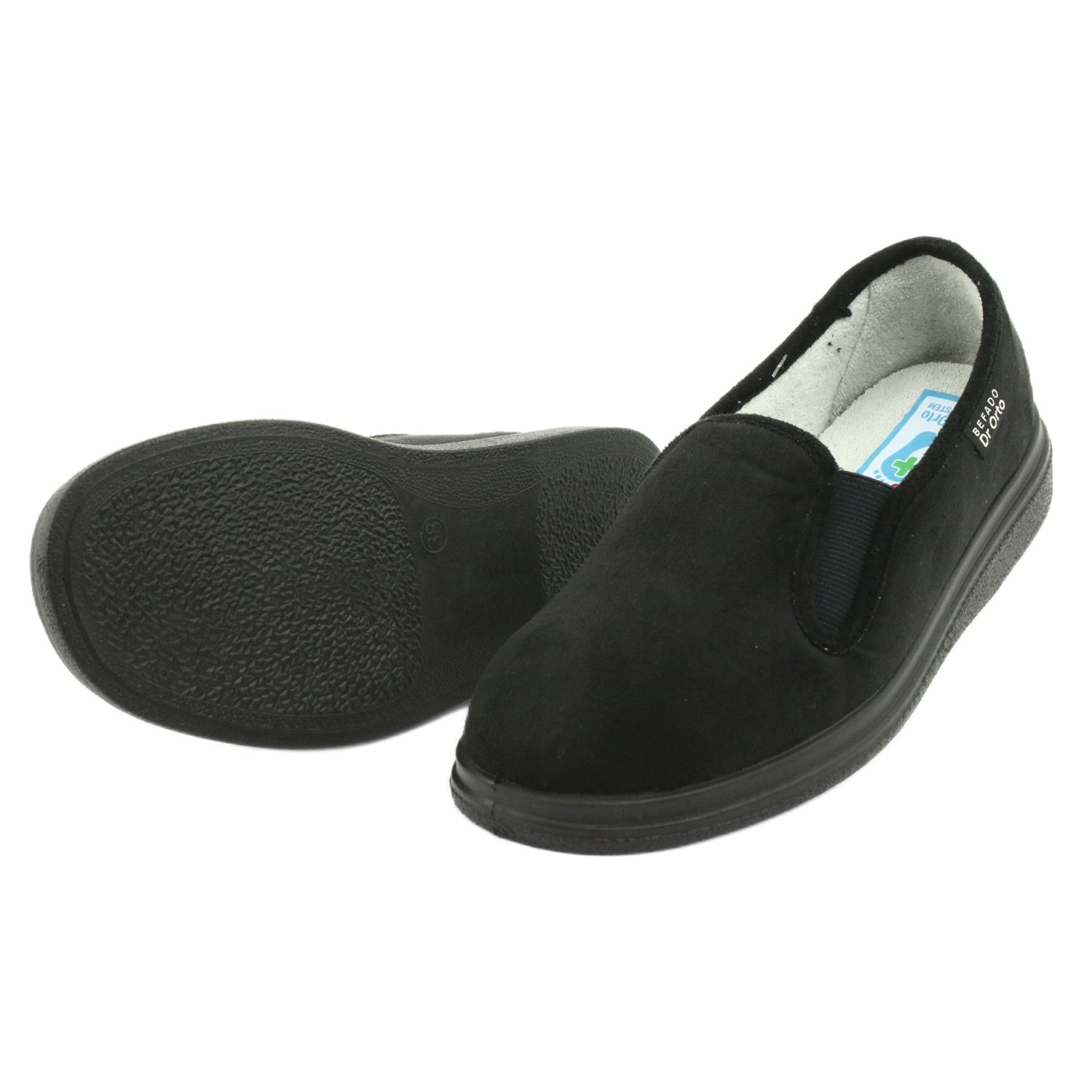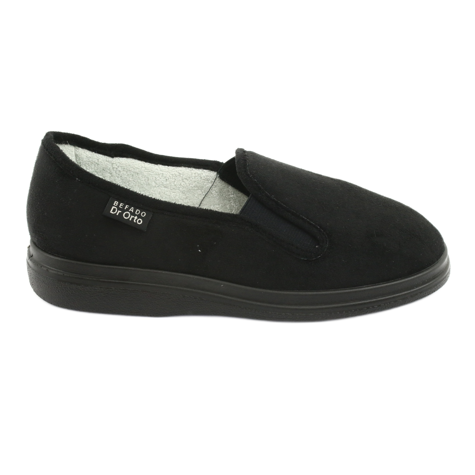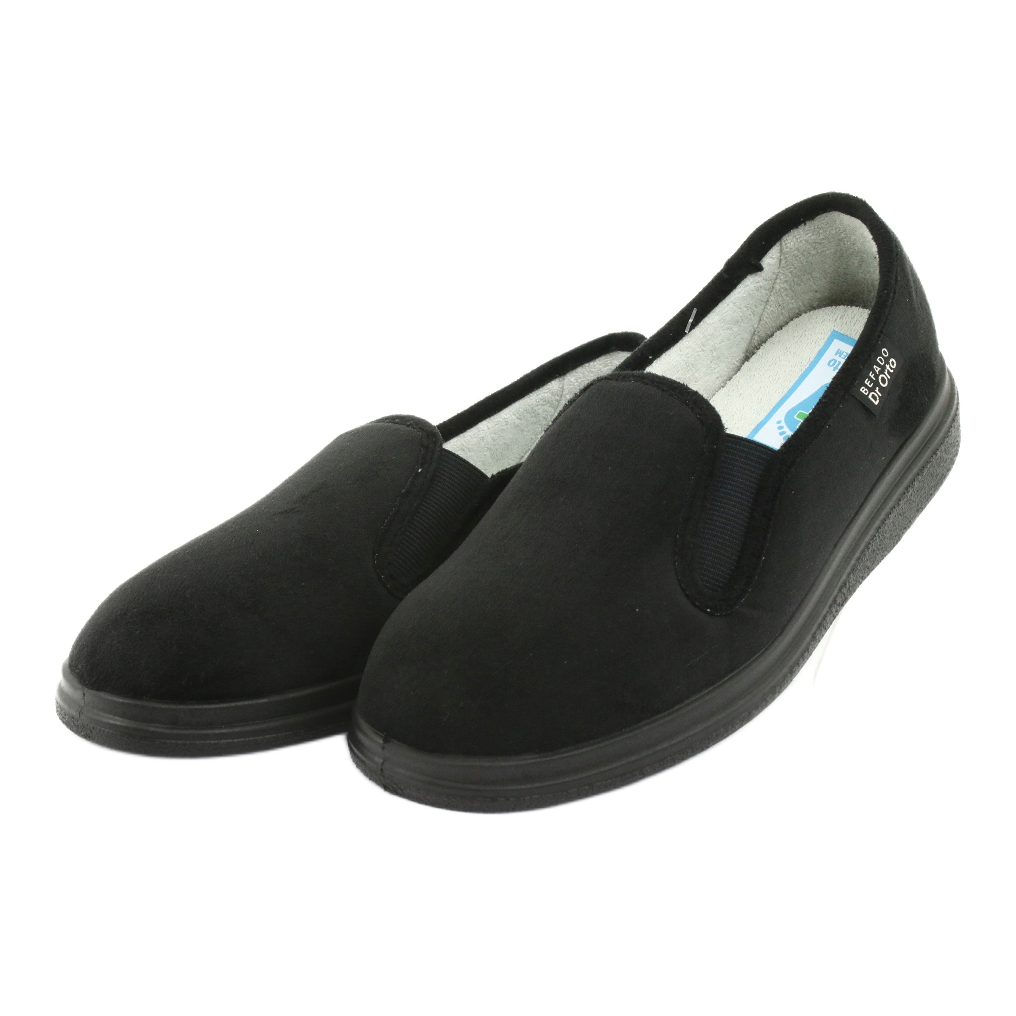 Befado 991D002 - light, comfortable women's slippers in black, created for sensitive and requiring maximum comfort. The model with high fatty provides a wide and tall nose, thanks to which the fingers are freely arranged, and the footwear does not compress even with swelling feet. The number of stitching and joints inside the shoe has been minimized, which reduces the risk of abrasions and irritation - a solution also recommended for people with diabetic foot.