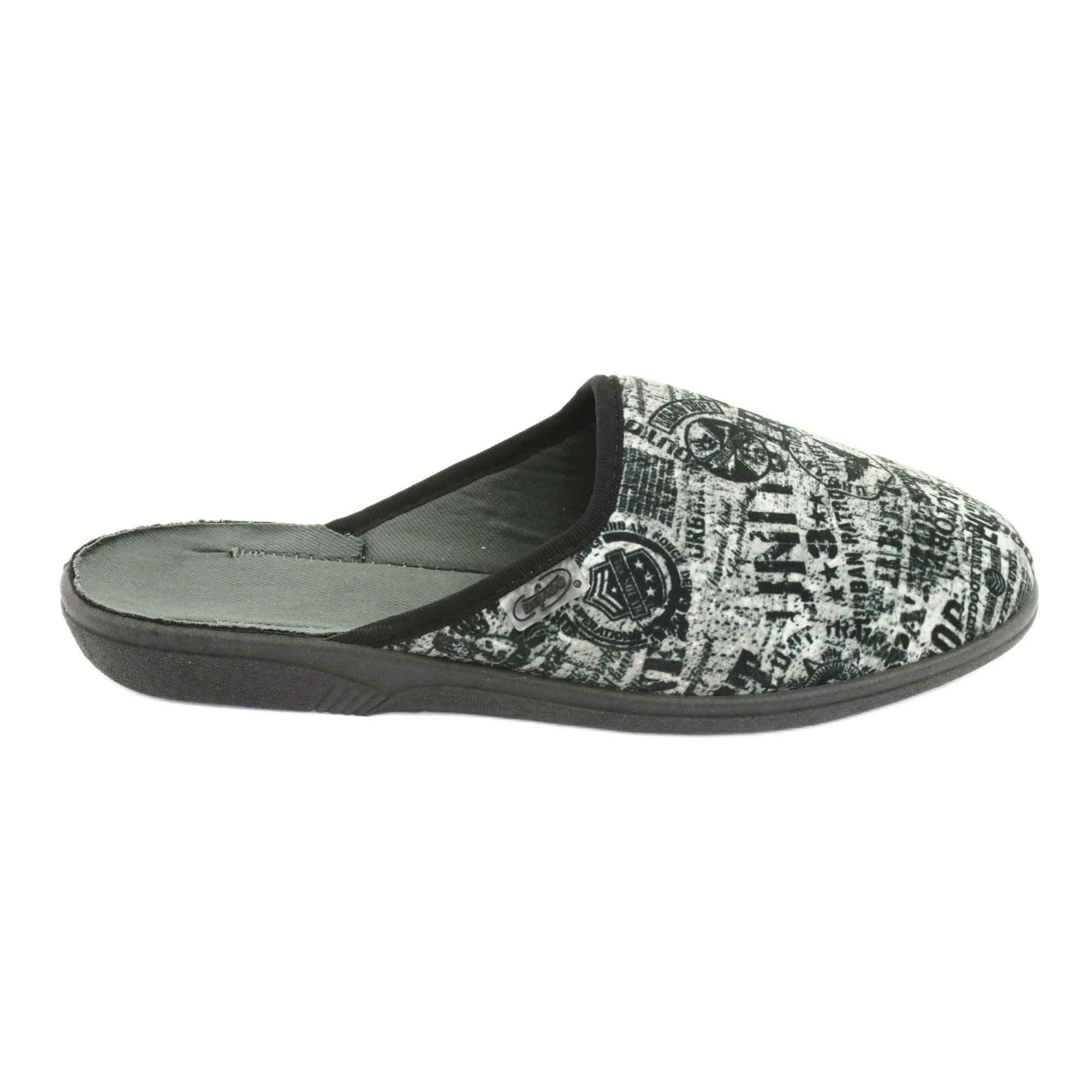 Practical, comfortable home slippers from Befado - model 201Q091 in gray color with prints. Slipped flip flops with a built -in toe provide to protect your fingers, and the hard sole protects the feet against cold even on cool tiles. The soft fabric insert increases the comfort of use and provides breathability.