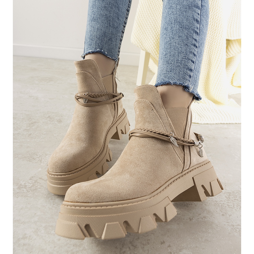 Discover the unique charm of the beige ankle boots with a Fearless bracelet, which are the perfect addition to any autumn and winter style. Made of eco-suede leather, these unique ankle boots combine elegance with comfort, offering a round toe with a slightly worn effect, which adds to their distinctive style.