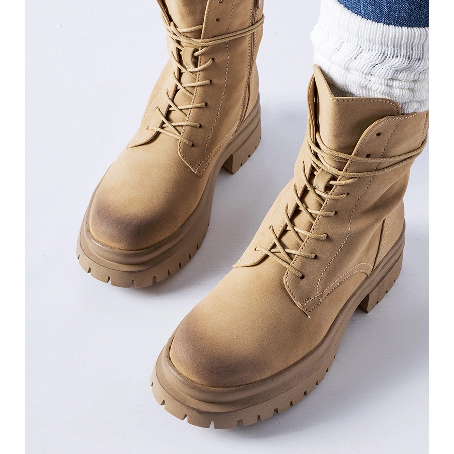 Modern trapers in universal, beige color that combine free style with practical solutions for the autumn -winter season. The worn nose gives them the character and slightly "raw" accent, and the round shape of the fingers ensures comfort and more space for the foot.