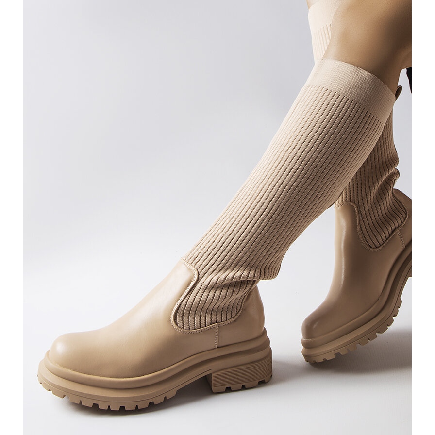 Beige Montere boots are a universal model combining timeless aesthetics with practical solutions. The elastic upper adapts to the calf, providing comfort with prolonged wear, and insulation protects against cold in the autumn and winter season. Ecological leather with a subdued shade Khaki goes well with both casual and more elegant stylizations. The rubber sole guarantees adhesion and durability, and the low heel 5.5 cm ensures stability and comfort of walking.
