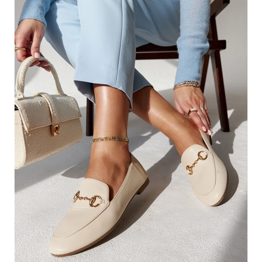 These loafers have a beautiful, beige color that goes perfectly with various stylizations. An additional advantage is the details in the form of a chain that give them a unique character. The heel height of only 1 cm makes them very comfortable to wear all day, and the brown plastic sole guarantees durability and stability.