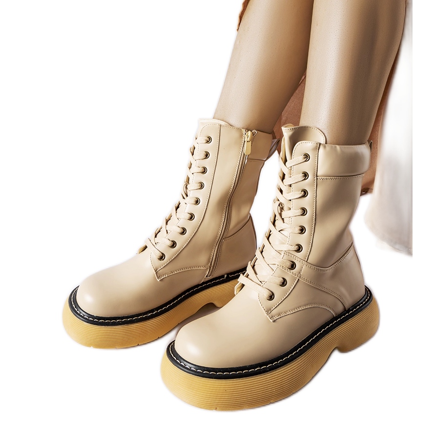 Stylish, beige Davi workers are a combination of a fashionable look and practical warming - perfect for cooler days. Made of ecological leather, on a stable rubber platform (approx. 5 cm), provide comfort and a modern cut reaching up to the ankle. A classic, round nose and binding plus a lock are facilitated by matching and putting on. The model is available in the original box with CE certified.