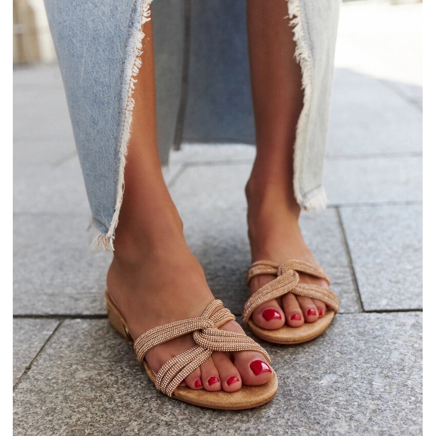 Details: Beige low-heeled flip-flops decorated with Ulma rhinestones