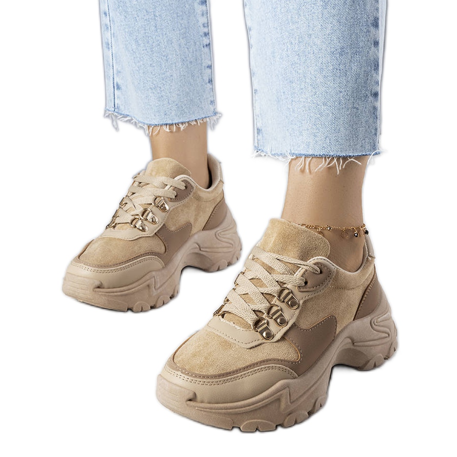 Modern and feminine - beige Jenna sneakers combine the original design and comfort of wearing. The upper made of a combination of ecological leather and fabric looks effective and gives the shoes lightness, and a fashionable, expressive sole is a real icing on the cake of this model. Thanks to the neutral, beige shade (beige/khaki), you can easily adapt to everyday and slightly more elegant stylizations.