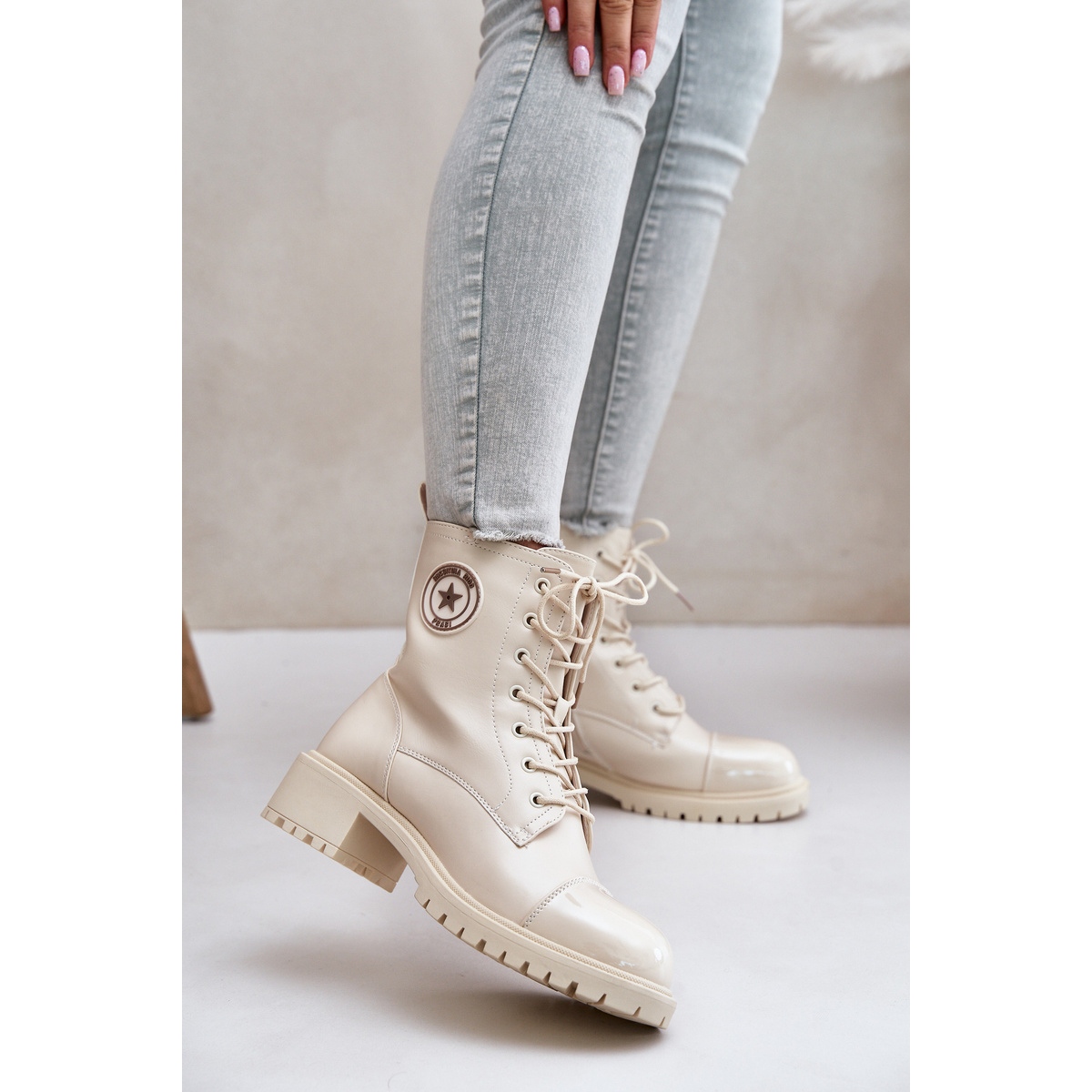 Thanks to the height of the upper of 15 cm and width of 11 cm, these boots will perfectly match many styles, from casual to more elegant. Beige color and a minimalist pattern make them a universal addition to any wardrobe.