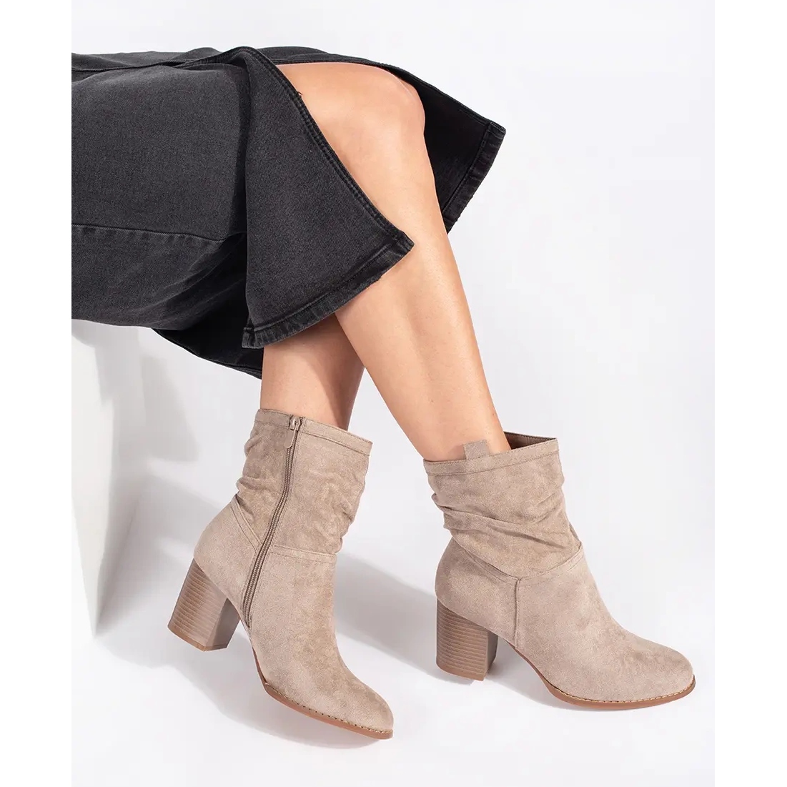 We present beige suede women's boots on a post from a reputable brand, which are a perfect complement to any stylization! This model, available in an elegant shade of beige, was made of high quality ecological leather in the form of suede, which gives it a modern and stylish look.