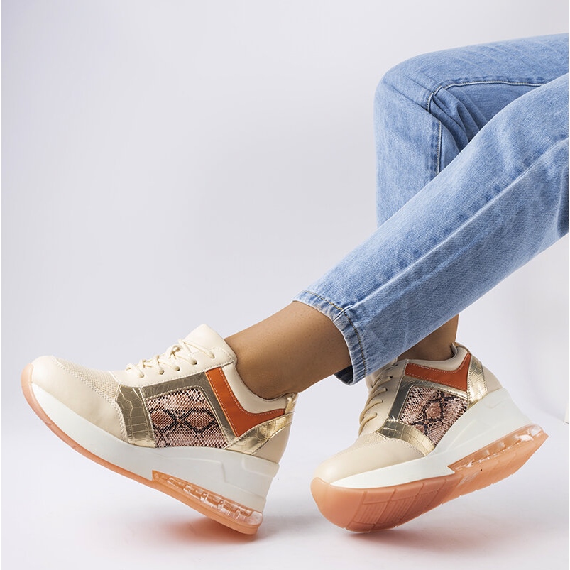 Made of high-quality eco-leather, the sneakers offer not only an aesthetic appearance, but also durability. An additional advantage is the practical wedge, which provides stability and support for the feet. The beige color with gold accents makes these shoes perfectly match various styles, both casual and more elegant.