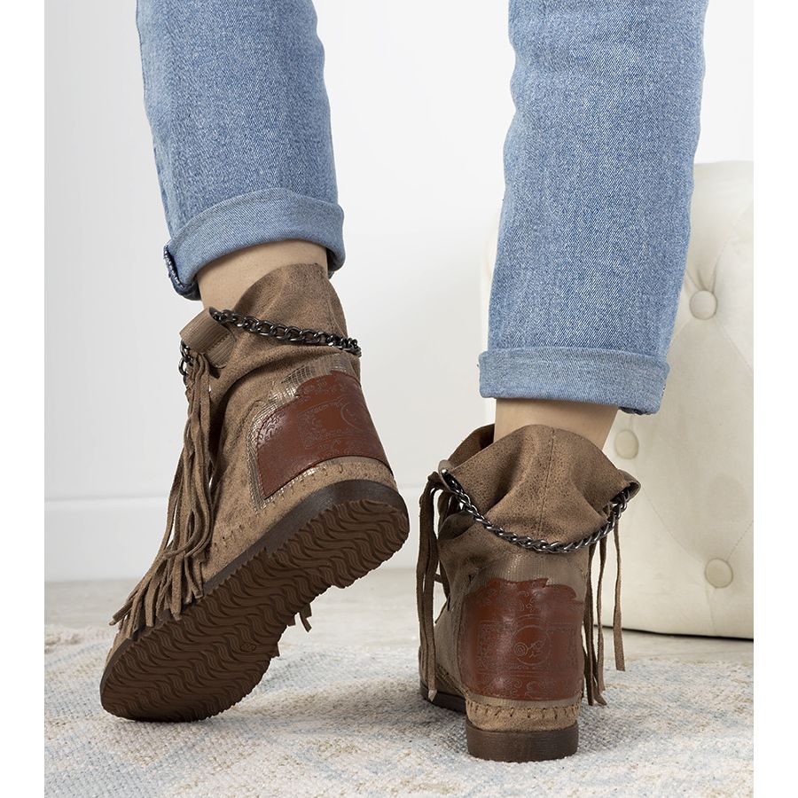 We present beige women's Maral ankle boots, which perfectly combine boho style with everyday comfort. Made of high-quality ecological suede leather, these ankle boots delight with lightness and elegance. Decorated with a metallic chain and fashionable fringes, they will perfectly complement any autumn-winter styling, adding a sophisticated character to it.