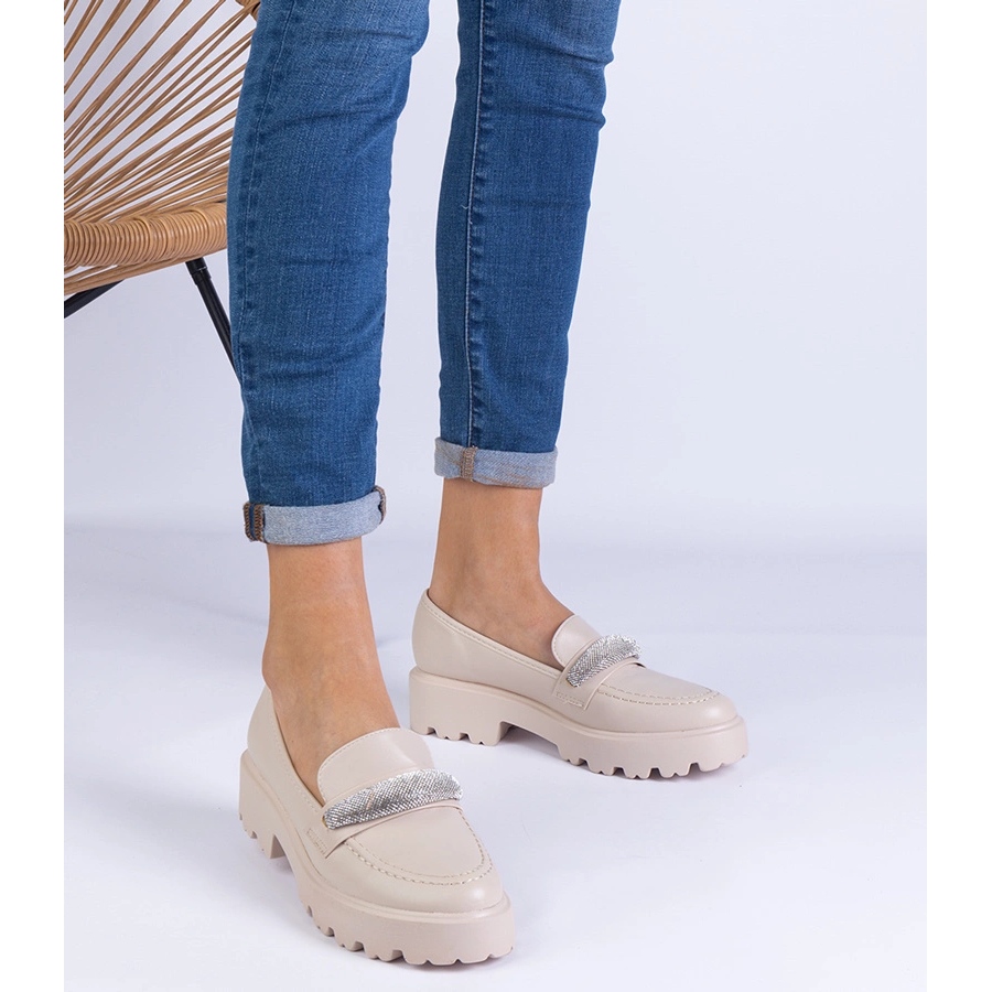Do not delay - add these unique beige women's loafers decorated with zircons to your collection today! Discover their versatility and discover how you can enrich your stylizations by adding elegance and splendor. Be on time with fashion and put on quality and timeless design that offer these beautiful loafers!