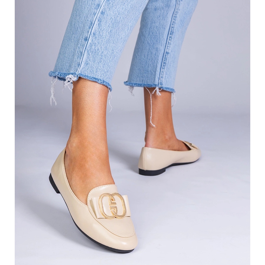 Details: Beige women's loafers with a golden decoration