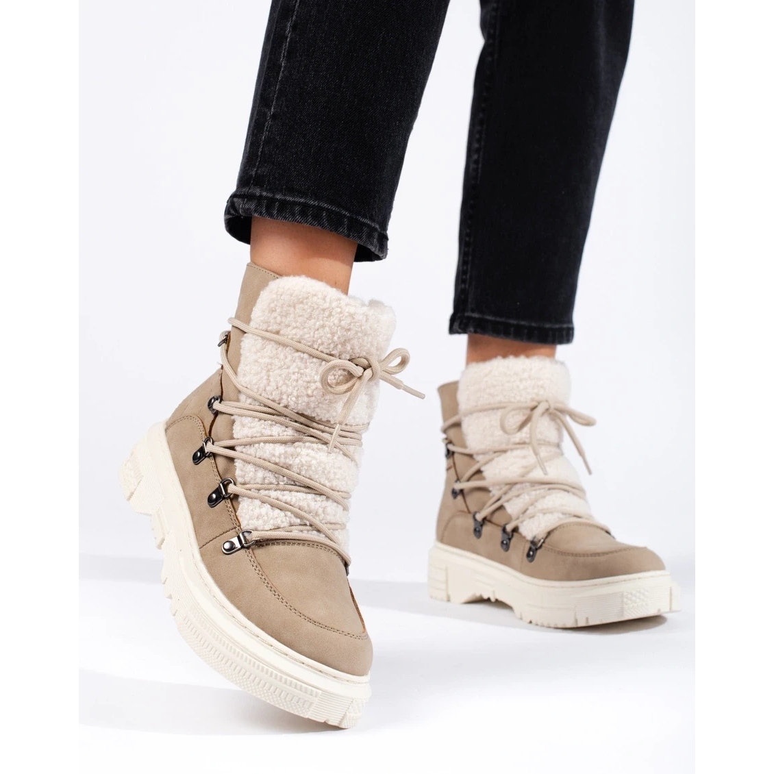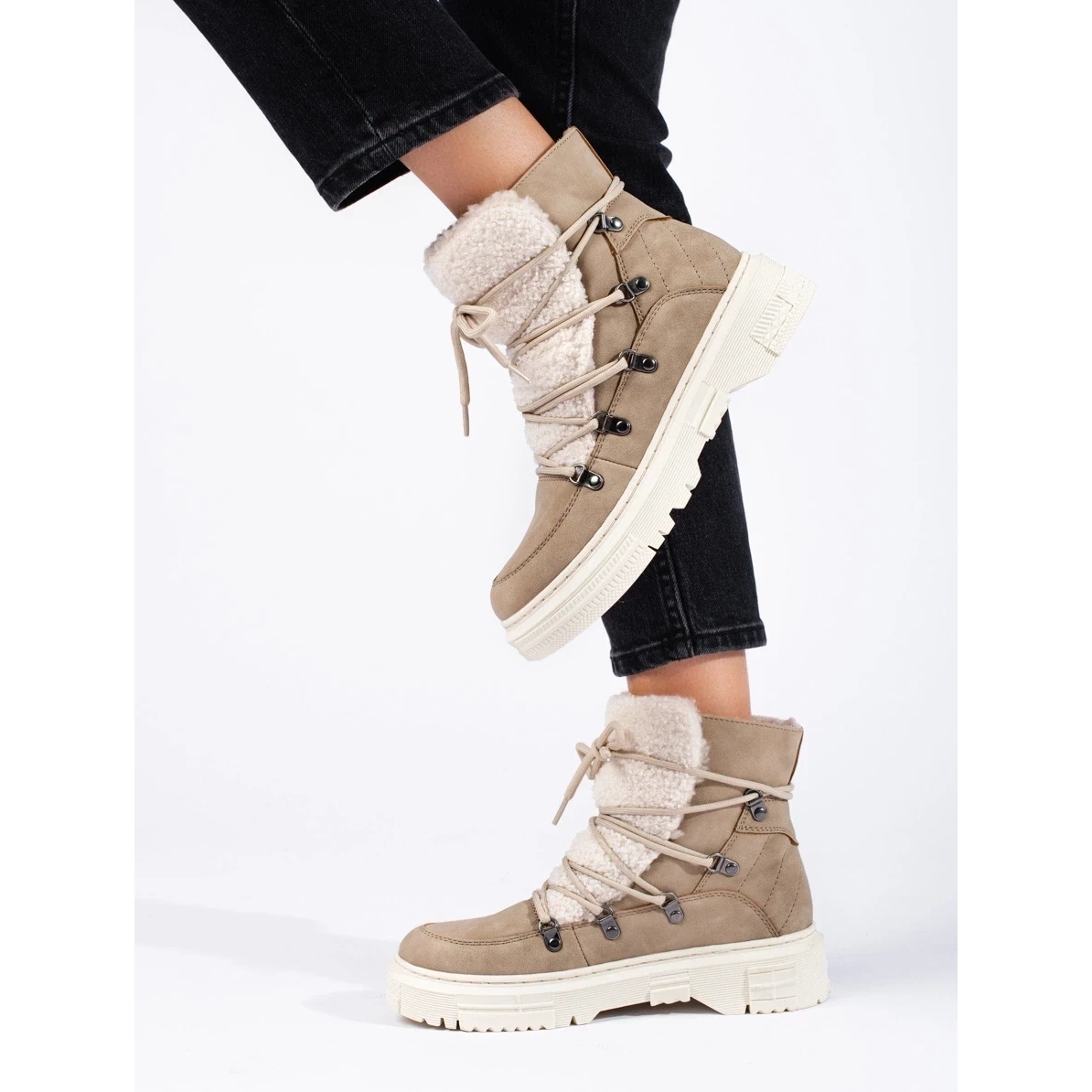 Beige snow boots with a sheepskin coat combine comfort and a fashionable look. The soft, insulated insert and textile interior guarantee heat and comfort at low temperatures. The ecological leather upper is easy to maintain and resistant to dirt, and a built -in, stiffened fester stabilizes the foot when walking. Lace -up allows you to adjust the width of the upper to your needs. A solid sole with a clear tread improves adhesion on slippery surfaces.
