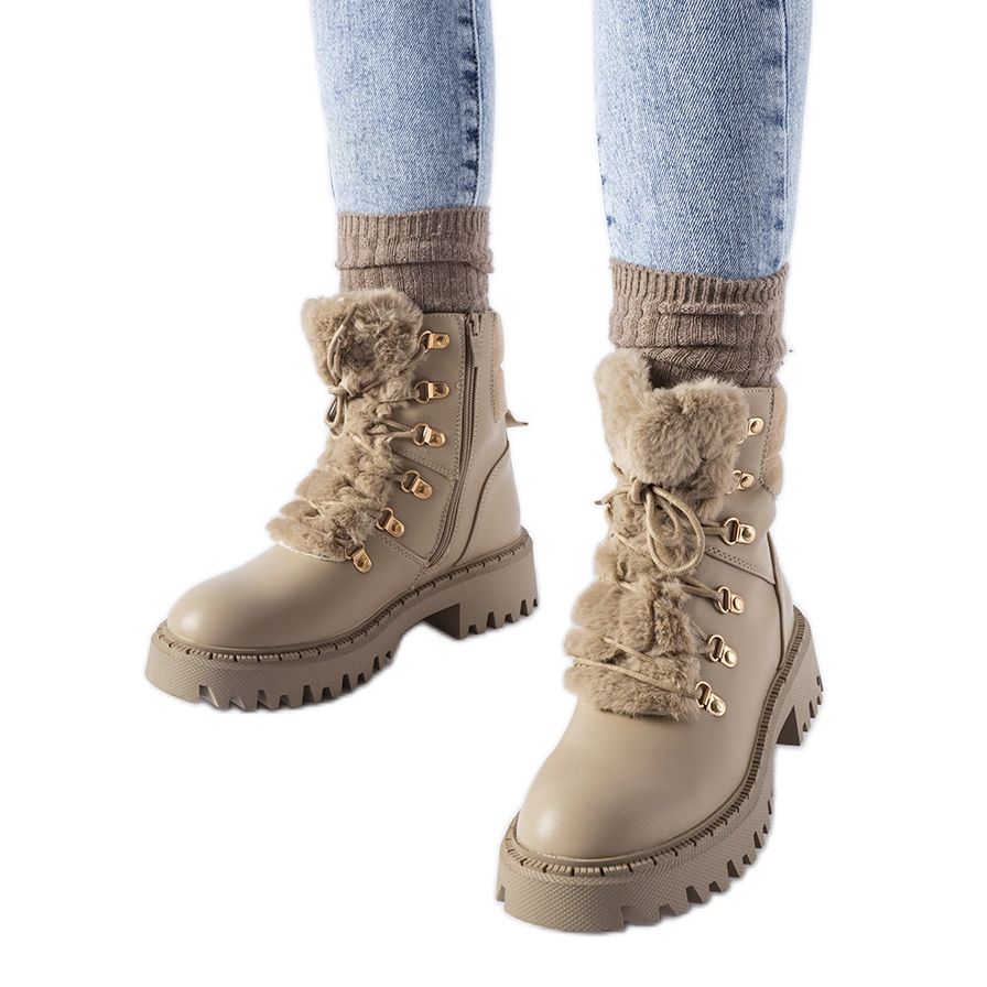 Elegant Quarto Workers in a fashionable shade of khaki (beige) is a proposal for women who value a combination of comfort and urban style. The insulated interior and the rounded nose guarantee comfort even during a long wear, and the decorative fur adds a unique character to the shoes and subtle femininity. The average, 5 cm flat heel sole and a rubber sole ensure stability and good adhesion on various surfaces. The lace -up clasp allows you to perfectly match the shoe to the foot, while the ankle height protects against cold.