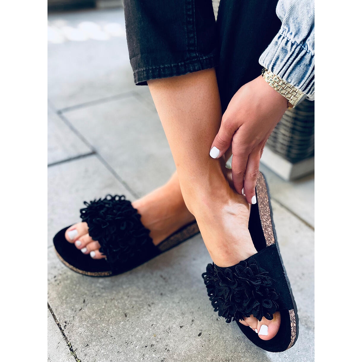 Discover the perfect summer flip-flops - Berry Black cork flip-flops in black, which combine elegance and comfort. These women's flip-flops, made of high-quality ecological suede, attract attention with a subtle, floral pattern that will add charm to any summer styling.