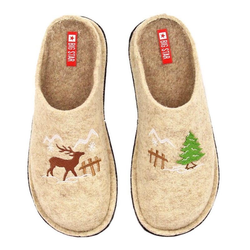 Comfortable, stylish home slippers big star int1803a in a universal beige color - perfect for cooler mornings and evenings at home. Made of soft felt in combination with a synthetic upper, they provide a pleasant feeling of softness and good contact with the ground. The classic, low cut with a round toe and Christmas embroidery adds charm to them, and the discreet manufacturer's logo emphasizes the quality of the finish.