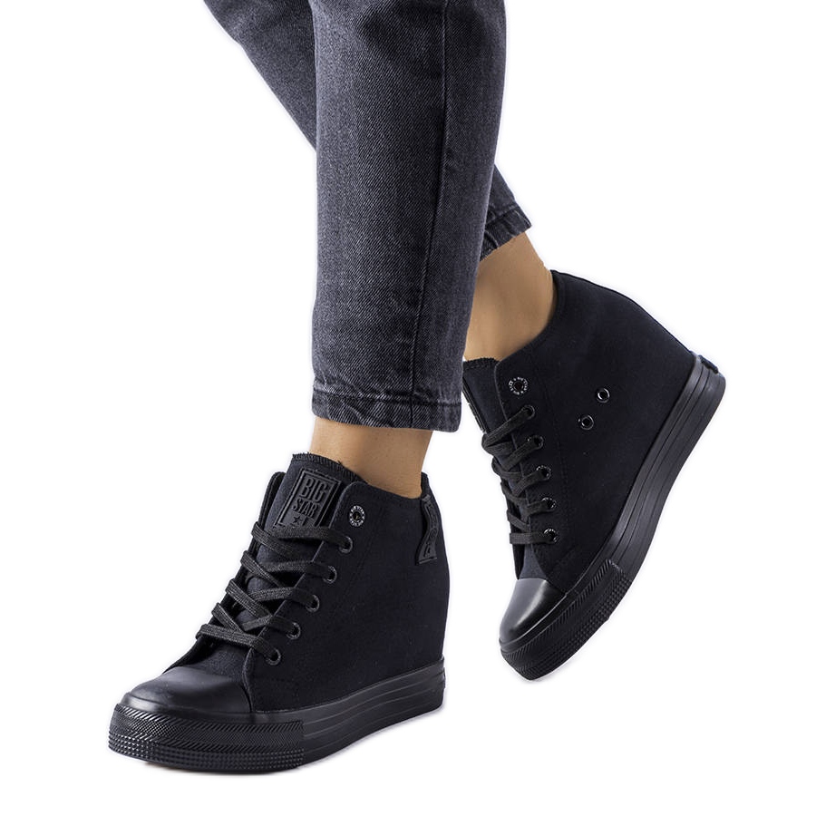 Modern, convenient and universal - Big Star LL274034 wedge sneakers are a proposal for women who value sports style with a subtle lift. Made of high -quality black fabric, they are perfect for everyday stylizations in the summer season.