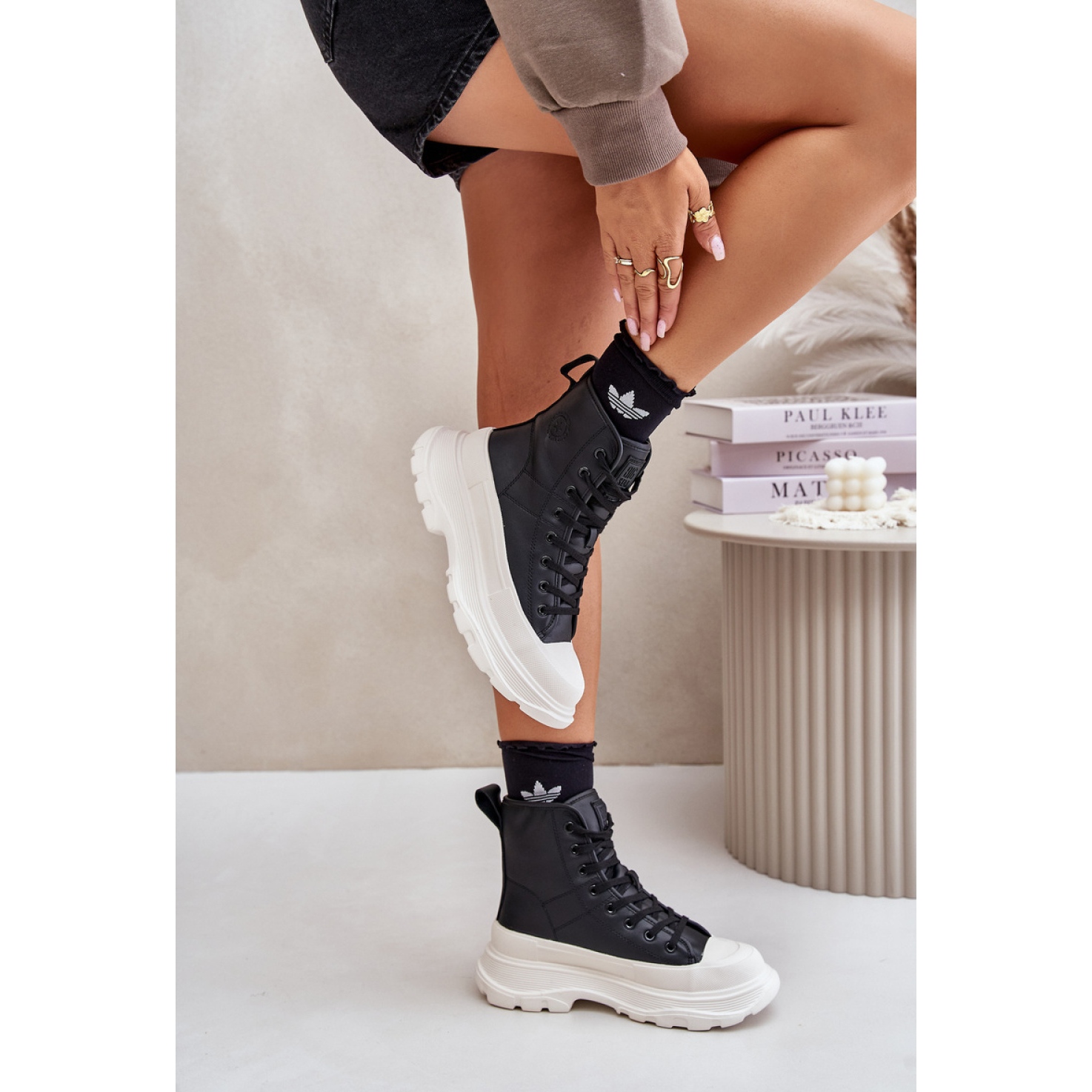 The sneakers have been designed for comfort of use. The interior insulated with a pleasant sheepskin coat provides heat, and the laced clasp allows you to perfectly match the foot. Their high upper reaching 14 cm gives the shoes a fashionable character, and the round nose gives them subtlety.