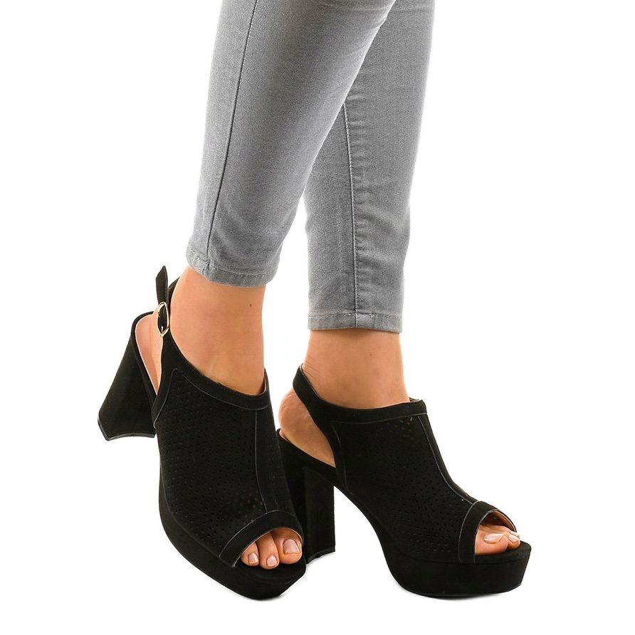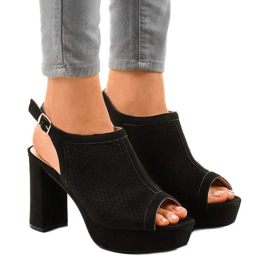 Black openwork heeled sandals 9R82 are the perfect choice for women who want to combine style with comfort. These elegant shoes perfectly match summer styles, adding chic and class. Made of high-quality ecological suede leather, they provide not only an aesthetic appearance, but also durability.