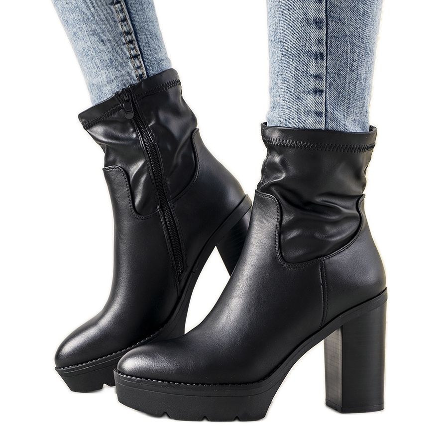 Black ankle boots with a block heel made of elastic Quality fabric are a great choice for spring and warm autumn days! These elegant shoes, made of eco-leather, combine style and comfort. The elastic material makes it fit perfectly to the feet, and the high heel with a height of 11 cm will beautifully emphasize the line of the legs, adding slimness to them.