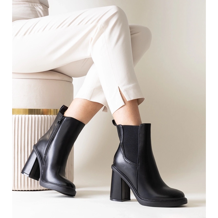 Black boots on the Almase eco leather post is the perfect choice for women who want to add a modern and elegant expression to their stylizations. These boots are characterized by a bay design, which will certainly attract the attention of the environment. Their minimalist form and classic black color make them fit many different outfits, allowing them to freely combine them with both everyday and more elegant stylizations.