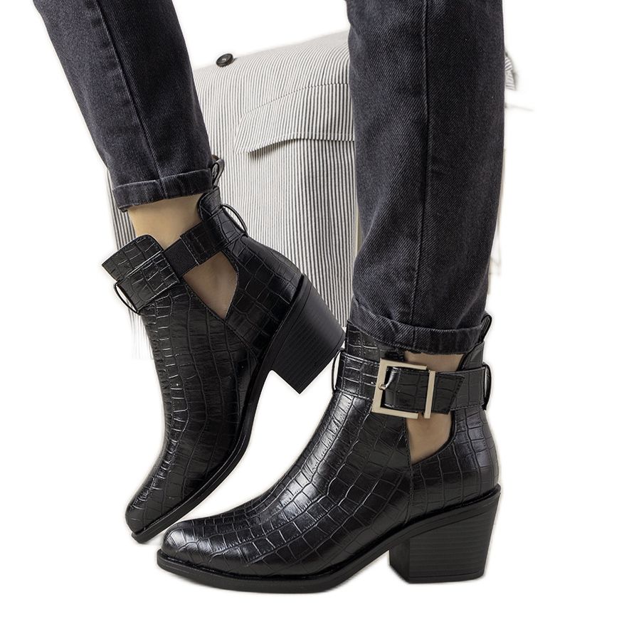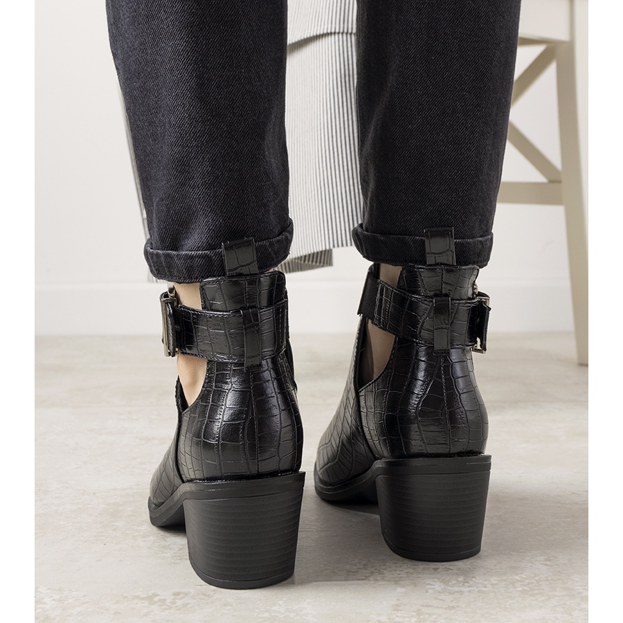 Black Moderniso block heel ankle boots with cutouts are the perfect choice for women who want to combine elegance with comfort. This model impresses with its unique pattern that imitates crocodile skin, which adds character and exceptional style. Thanks to the practical slip-on and adjustable strap around the ankle, the fit to the foot is extremely comfortable.