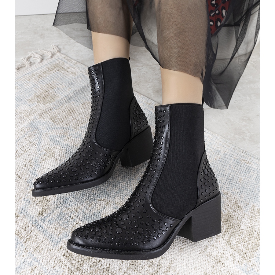 Thanks to decorative black rhinestones, Camus ankle boots stand out from other models, attracting attention and adding a dash of spice to the entire style. The pointed toe and fitted upper optically slim the legs, making them a great choice for various occasions – from casual meetings to elegant outings.