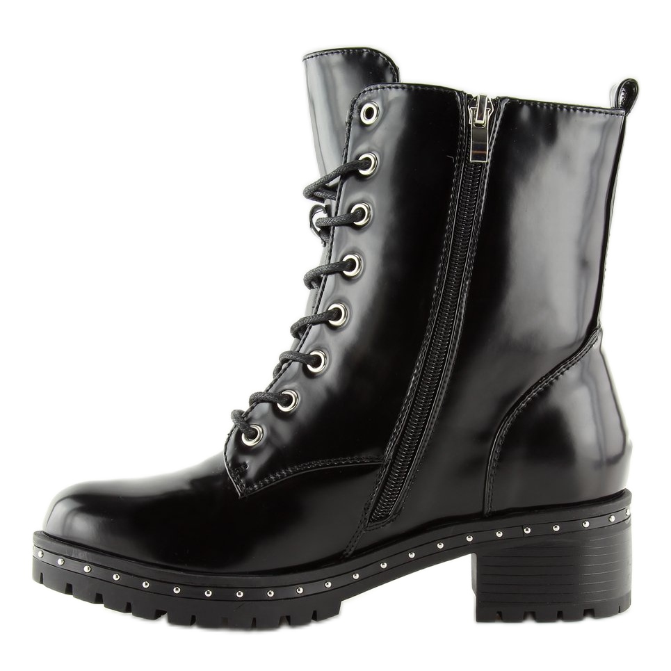 Women's black combat boots A-40 black are the perfect choice for women who want to add a bit of rock style to their wardrobe. Made entirely of high-quality eco-leather, these boots feature a patent finish that catches the eye. Impressive studs along the sole and decorative silver zippers are details that give them character and make them stand out from the crowd.