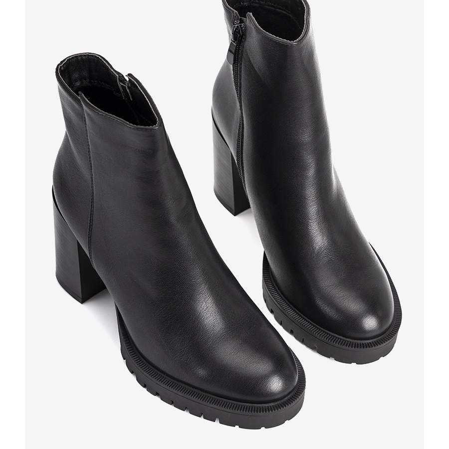 The high, thick 10.5 cm heel optically lengthens the legs, and the comfort of wearing makes the boots ideal for both everyday outings and more formal occasions. The classic round toe adds a stylish character to them, and the black color means they will match many styles.