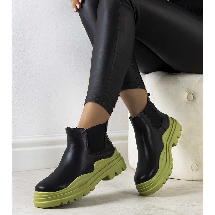 Elegant, women's boots made of ecological leather in classic black, which catch the eye with an original green platform. The upper equipped with inserts made of flexible material make it easier to put on and perfectly adapts to the leg. A round nose and a sliding fastener ensure convenience of wearing all day.