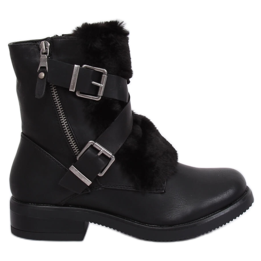 We present the 1061A-PA Black fur ankle boots – the perfect footwear for women who value style and comfort! These unique ankle boots are characterized by a high upper and an original design that attracts attention. Soft fur on the front and a fashionable detail in the form of buckles perfectly fit into the military style, making these shoes an absolute hit of the season.