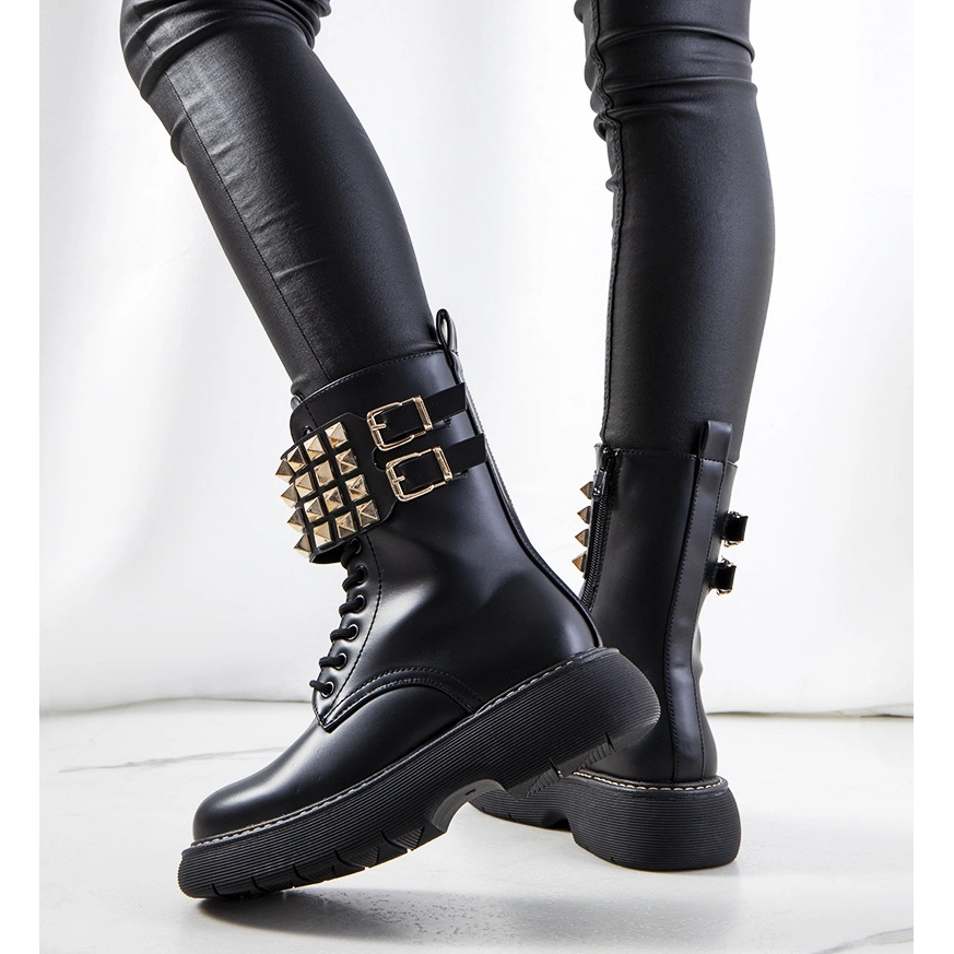 We present black Lacer studded ankle boots from the PA1 brand, which will certainly add character to any styling! These fashionable footwear combine great design with high quality workmanship. The upper decorated with gold studs makes the ankle boots look amazing and eye-catching. The high sole subtly emphasizes the legs, and the flat heel ensures comfort of wearing all day long.