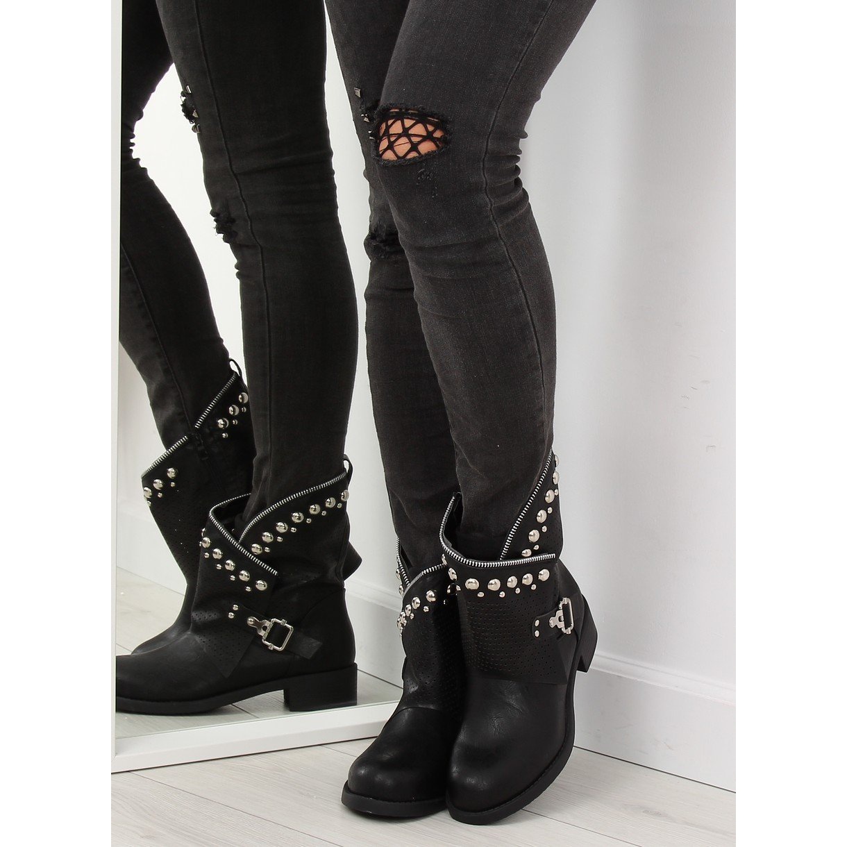 Discover the unique ankle boots with openwork upper black 7166-PA black, which are an absolute must-have in every woman's wardrobe! These incredibly stylish ankle boots with a flat heel are the perfect combination of comfort and fashionable expression. This season, openwork elements dominate, and these shoes will certainly attract attention thanks to their unique upper and spectacular decorations in the form of studs and buckle.