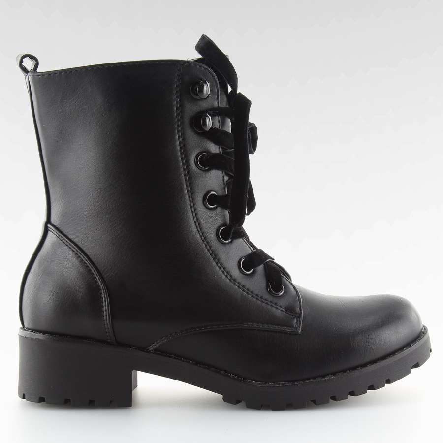Black military-style boots that combine the raw character of bovver boots with a delicate accent of velvet ribbon instead of traditional laces. A solid sole with a protector and a low 4 cm heel emphasize their character, and the internal zipper makes it easy to put them on every day. Made of ecological leather, with foam lining - they provide comfort and additional warmth on colder days.