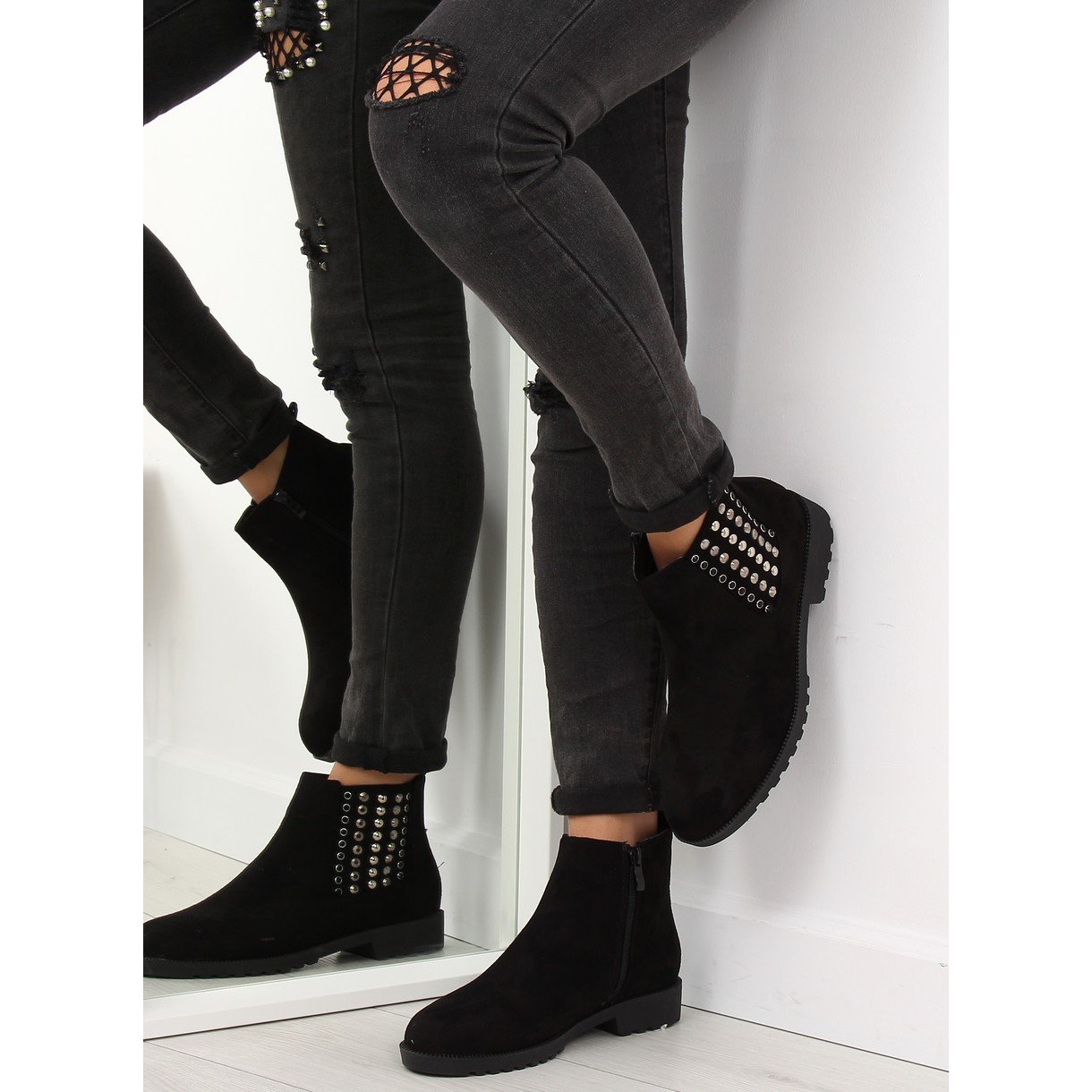 Discover exceptional style and comfort with the 108-107 Black women's ankle boots! These elegant ankle boots with a trapezoidal sole are a great choice for women who want to combine fashionable design with everyday comfort. The black suede finish complemented by shiny stones on the sides makes these shoes stand out from the rest.