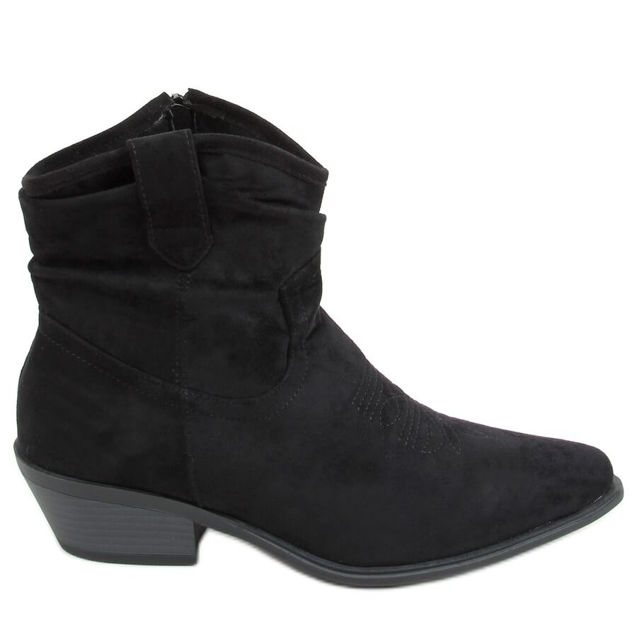 Women's black cowboy boots 99-65 Black are the perfect choice for women who value both style and comfort. Made of high-quality ecological suede, these boots feature subtle embroidery on the front, which adds a unique character to them. A wide 5 cm heel ensures stability when walking, and a practical fastening on the side makes putting on and taking off the shoes extremely easy.