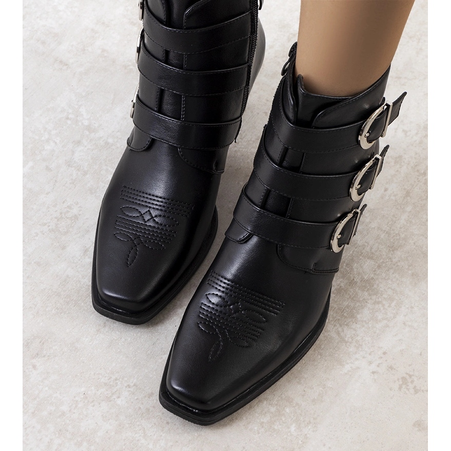 Black Montalvo cowboy boots - stylish boots on a daily basis that will add character to any stylization. Made of high quality ecological leather, they combine a classic cowboy cut with the comfort of everyday footwear. The upper is decorated with decorative stripes and a subtle embroidered pattern, the interior finished with thin material imitating the fur provides light warming - perfect in spring and autumn.