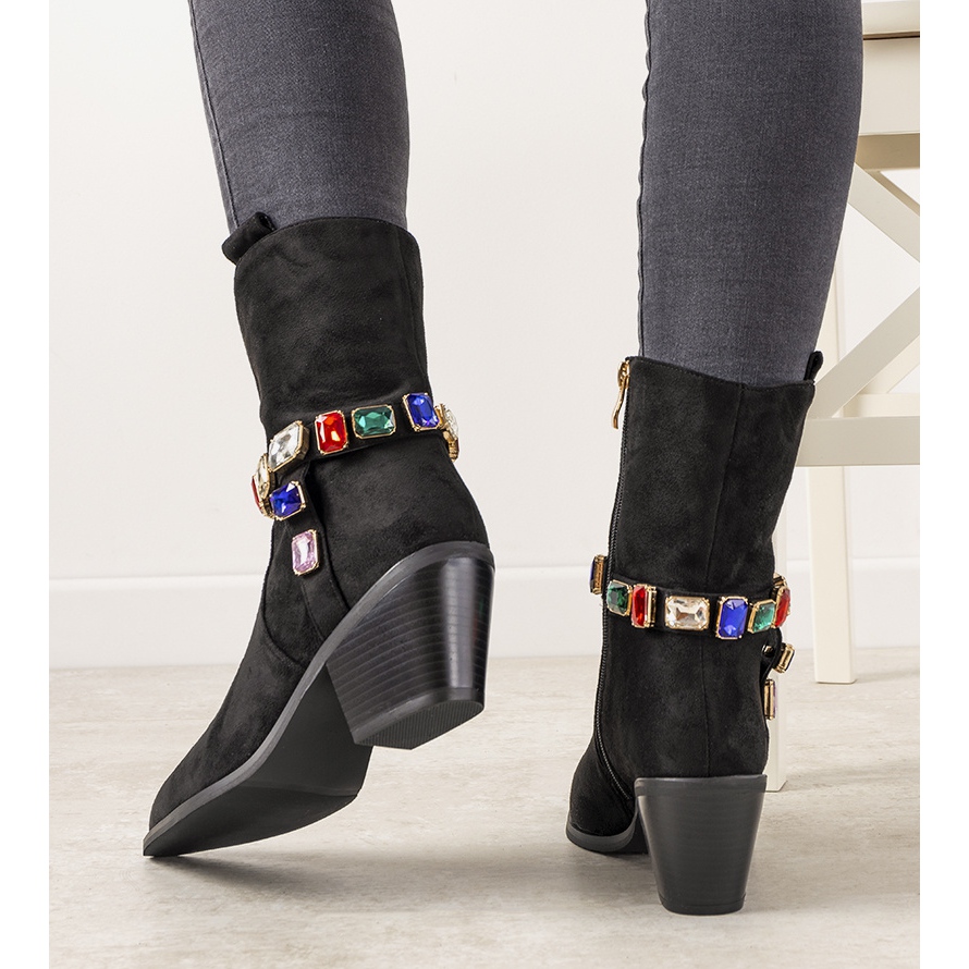Here are black cowboy boots decorated with colorful stones Mabella - an absolute hit this fall! These stylish boots impress with their unique design and high quality workmanship, which ensures comfort of wearing all day long. Made of suede eco-leather, these cowboy boots combine elegance with a fashionable look.