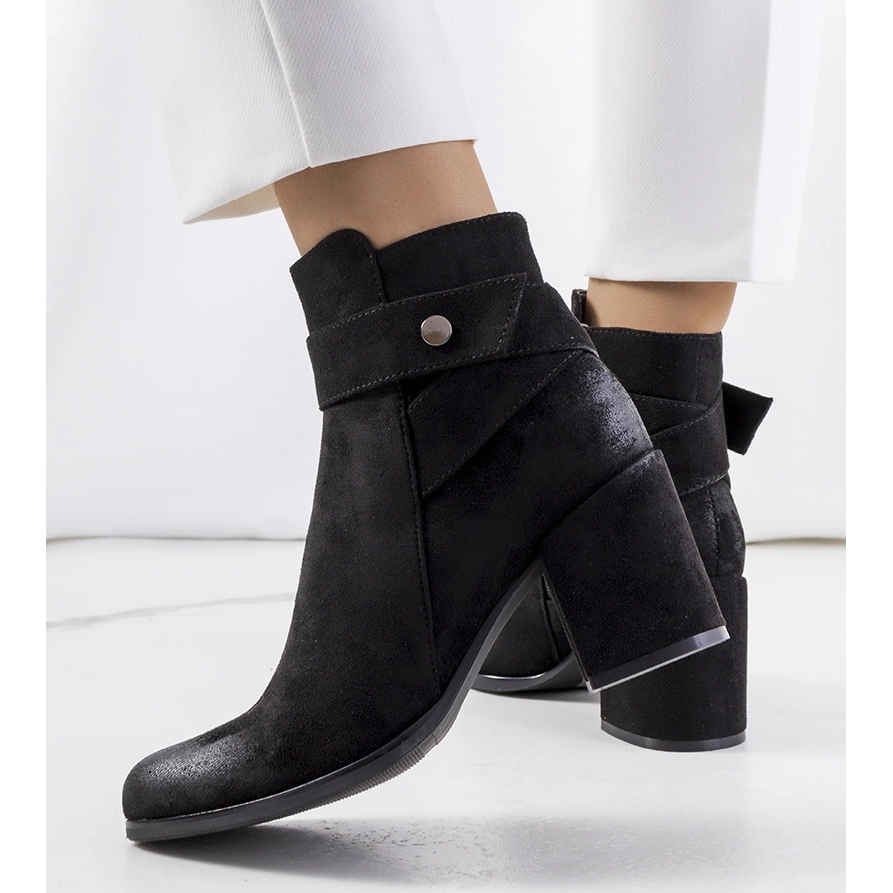 Black craydon boots - stylish and comfortable for cooler days. The asymmetrical upper reaching the ankle, slightly elongated at the front, creates a fashionable accent in everyday stylizations. Made of ekozamsz, with delicate warming (footwear blanket), they will provide comfort and protection against cold. The decorative strip of eco -leather at the ankle with imitation of a silver latch adds character, and the practical zip fastener makes it easier to insert. A stable piston with a height of 7.5 cm nicely models the figure, without giving up comfort.