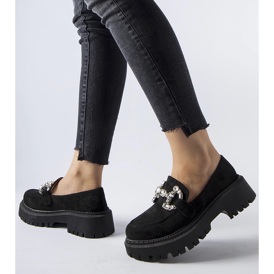 The rhinestones on the upper add a subtle sparkle to these loafers, making them an ideal choice for a variety of occasions – from casual meetings to more formal outings. The almond toe adds a touch of elegance, while the black colour goes well with many styles, offering versatility and charm.