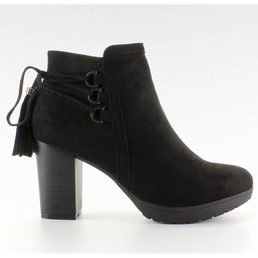 Stylish ankle boots made of ecological suede, combining comfort with a fashionable finish. They have a round nose and a wide, stable post with a height of 8.5 cm, which ensures wearing comfort all day long. Decorative lacing and subtle fringes on the back give the shoes character. There is a zipper on the inside for easy putting on.