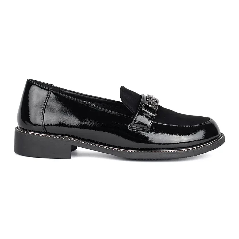 Discover elegance and comfort with black women's moccasins from a reputable brand. These stylish shoes perfectly combine a casual, classic and elegant look, which makes them a great choice every day. Their attractive design enhances varnished ecological leather and an effective chain that gives them character.