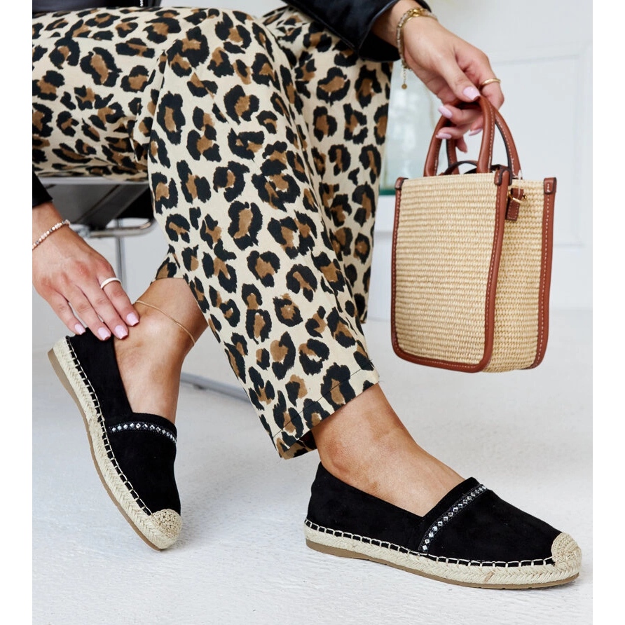 Black espadrilles with zircons ABIA is a great choice for summer days that will delight every fashion lover. Their elegant, round nose and a low, slip -up cut provide not only convenience, but also ease of putting on. These beautiful espadrilles are distinguished by a modern design and a rubber sole, which makes them perfect for hot, sunny days.