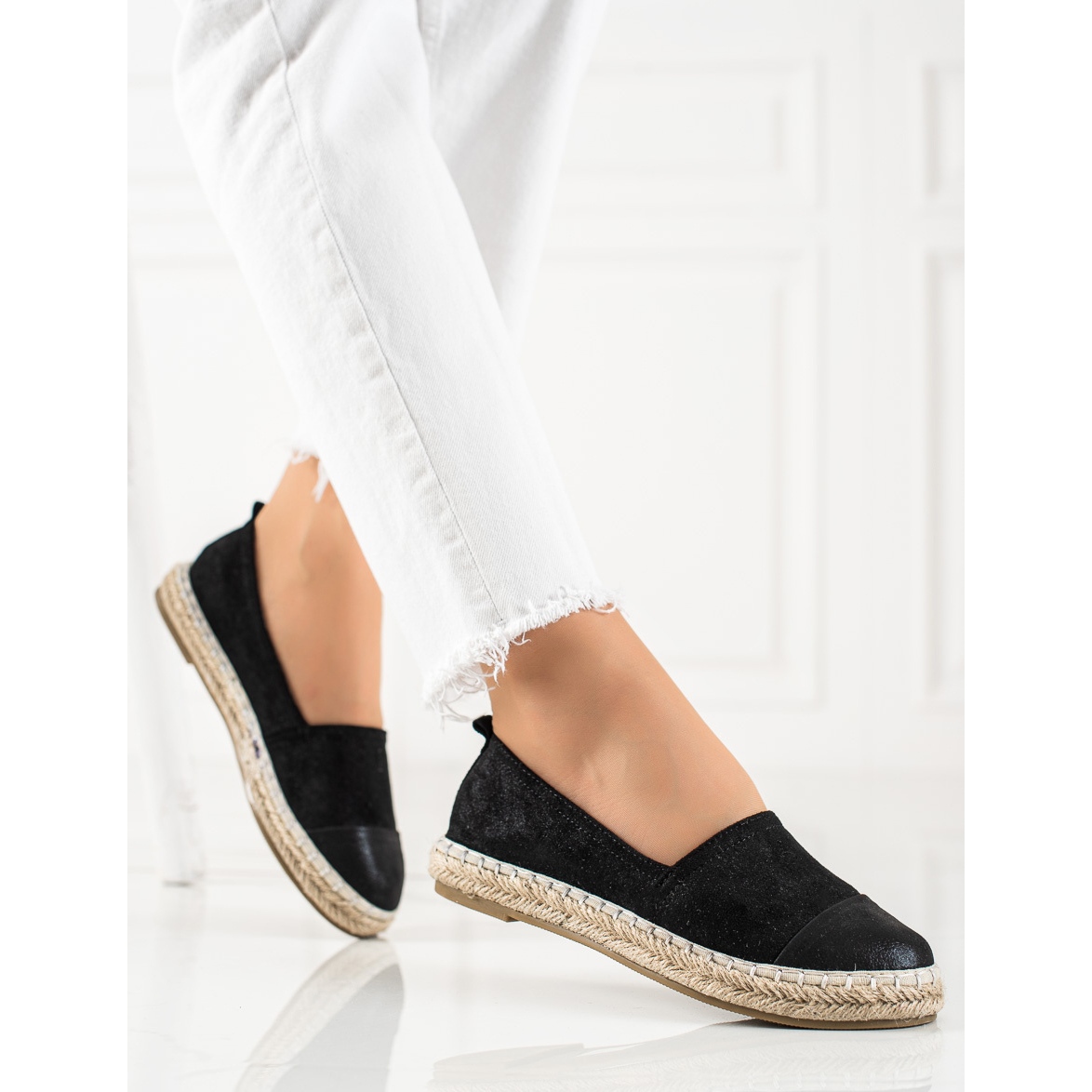 Discover elegance and comfort at any time with TRENDI black espadrilles with glitter! These unique women's shoes are the perfect choice for spring and summer, adding a unique shine to any style. Made of high-quality materials, the espadrilles have an upper made of imitation suede, which makes them both stylish and pleasant to wear.